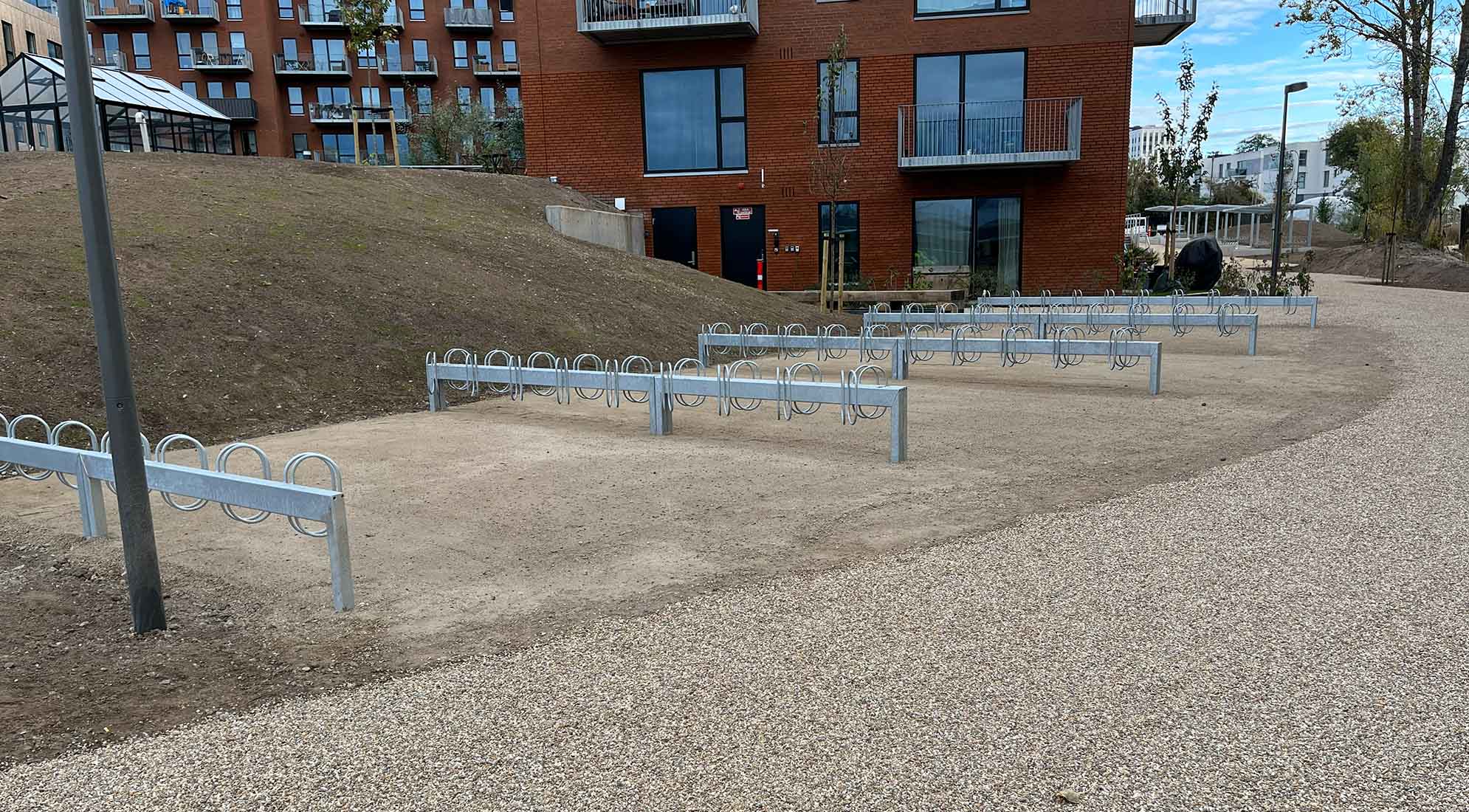 In connection with the new construction at Hørkær 8 in Herlev, DAV NORDIC has delivered a comprehensive and versatile solution for bicycle parking. The solution is designed to match the area’s open residential structure, where the apartments are arranged around shared courtyards and green orangery spaces. Here, the bicycle parking plays a crucial role in supporting residents’ daily mobility.
