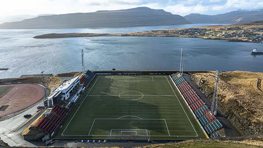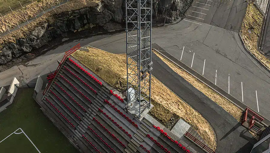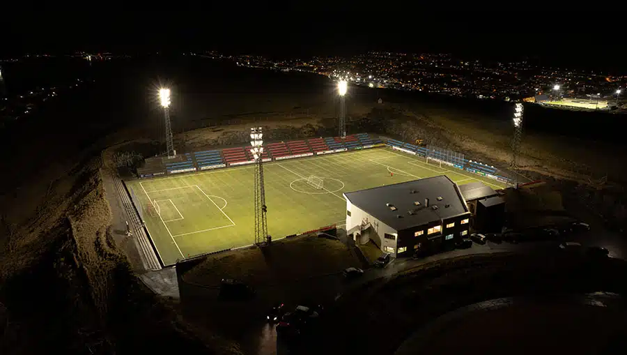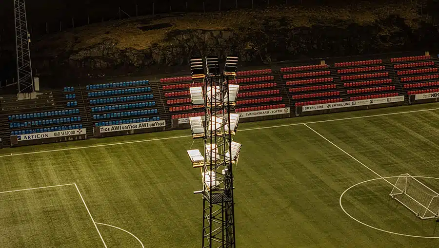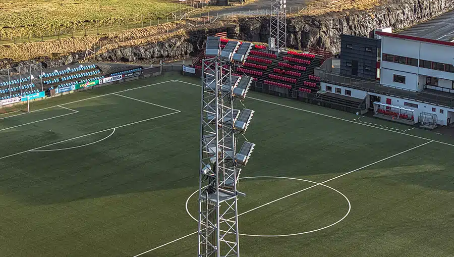 In Toftir, Faroe Islands, new lighting has been installed at the Svangaskarð football stadium. At DAV NORDIC, we have delivered four lattice masts to support the lighting fixtures.
