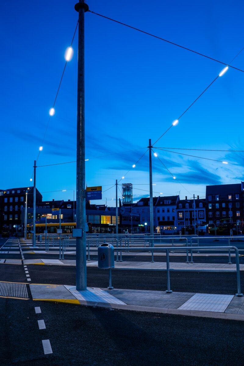 To ensure safe and secure traffic in the heavily congested area of Aarhus bus station, DAV NORDIC has supplied extra-strong steel poles for a wire suspension system with light fixtures. This creates a canopy of lights that illuminates the entire area.