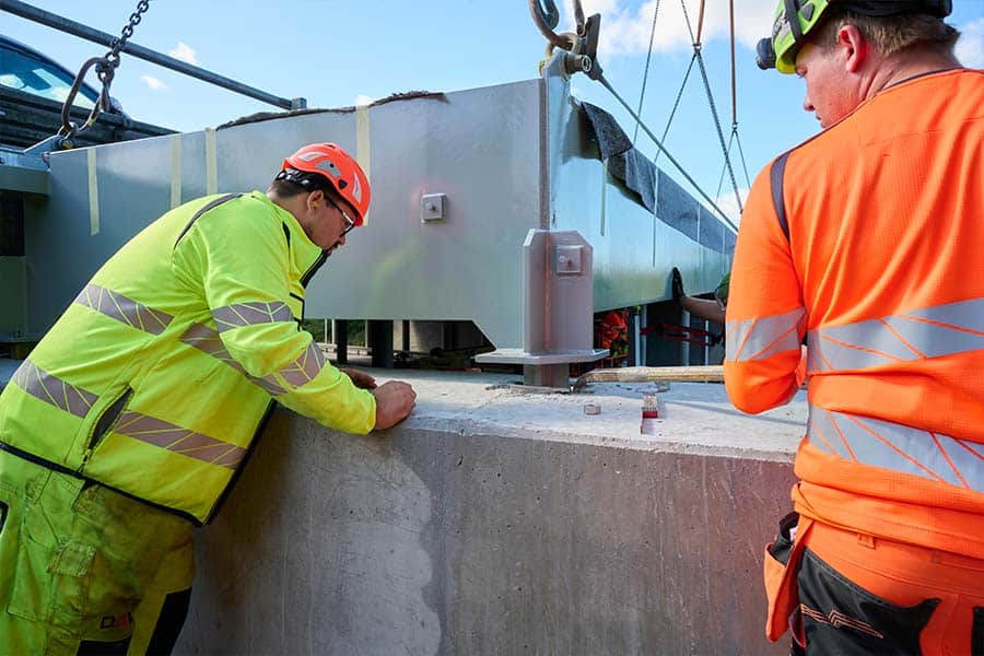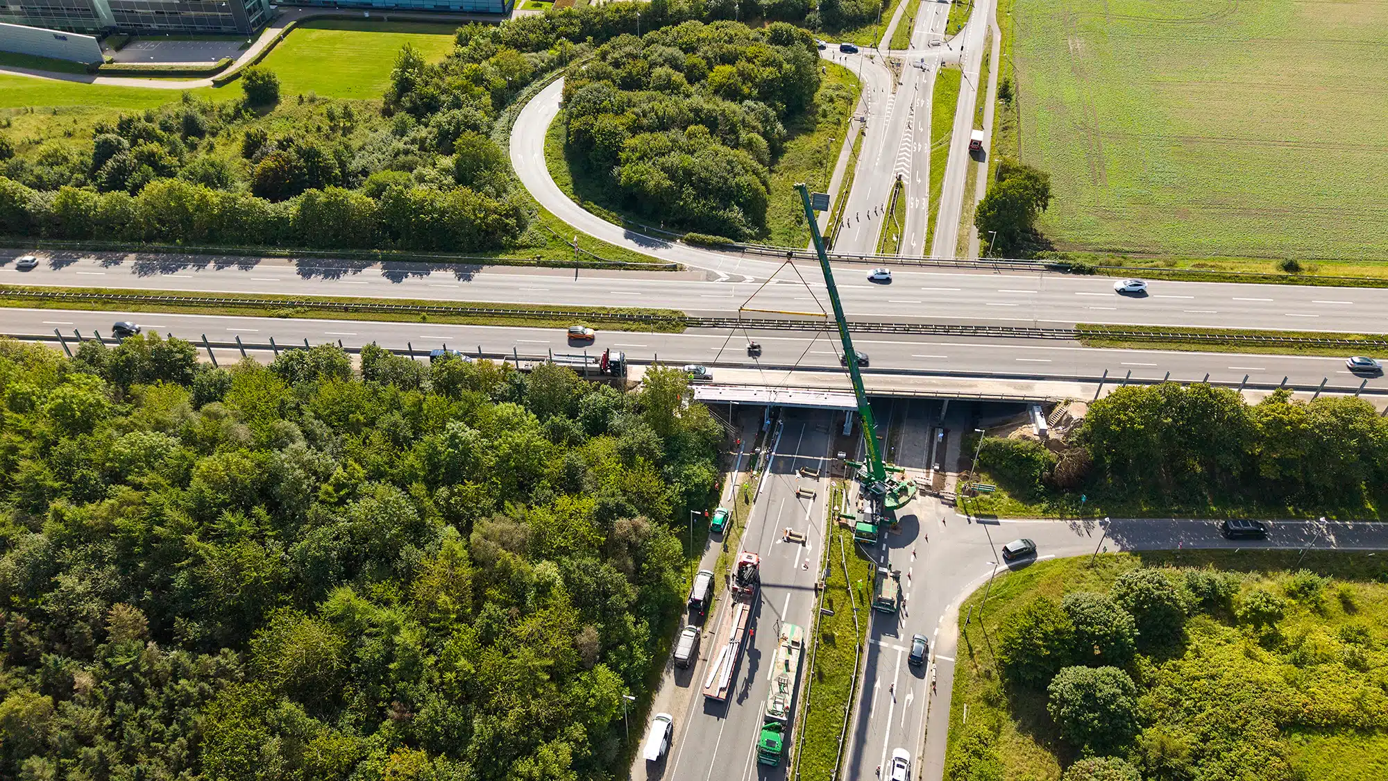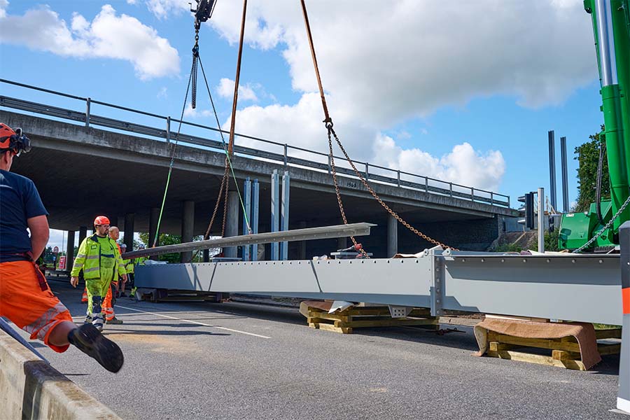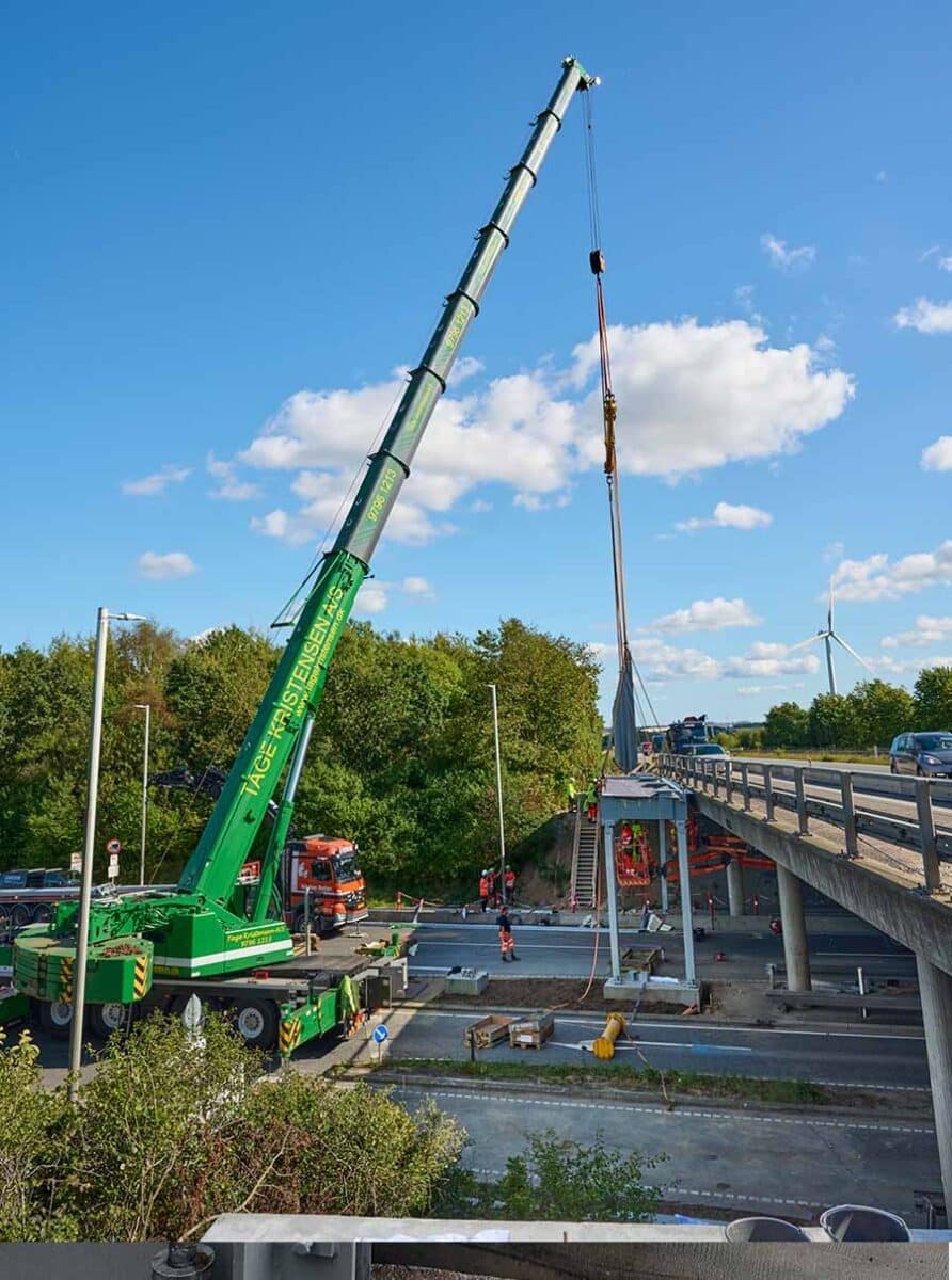 The most extensive part of this project was the 76-ton steel portal on the bridge over Hammelvej – a major undertaking that required meticulous planning and collaboration from everyone involved.The portal measures 50 meters in length, 2.5 meters in width, and 0.7 meters in height, with a total weight of 76 tons. It is supported by five intermediate supports and four bored piles, each 8 meters deep – in total, nearly 300 tons of concrete were used for the foundations.